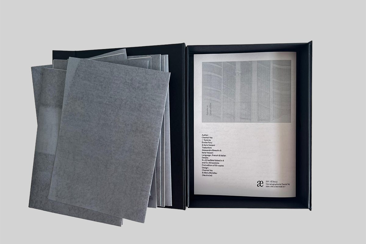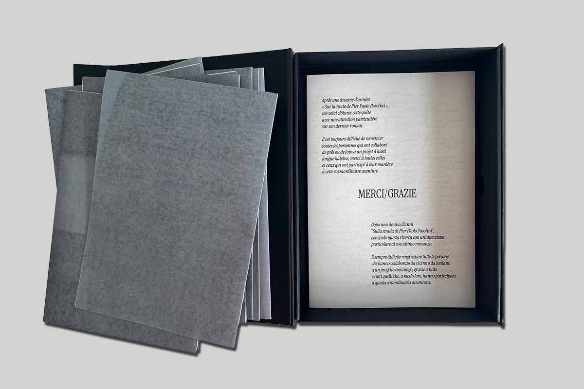Deux textes complètent cette édition d’artiste : une étude spécifique du roman de Pasolini par la chercheuse Ilaria Vezzani et un regard plus descriptif et poétique relatif au projet de Chantal Vey, par la commissaire d’exposition et critique d’art émilie Flory.